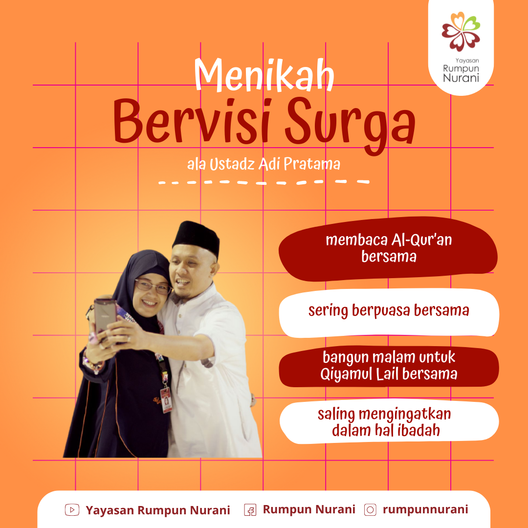 “Berdasarkan ayat tersebut, pernikahan yang dijalankan bukan perihal pembicaraan kapan membeli rumah, mobil, dan punya anak, karena itu adalah bab bonus,” kata Ustad Adi. Menurutnya yang seharusnya dibicarakan di antara pasangan suami dan istri adalah cara agar dapat bangun malam bersama, membaca Al-Qur’an bersama, dan sering berpuasa bersama. Dalam pernikahan, sepasang suami istri harus saling mengingatkan dalam hal ibadah untuk lebih mendekat kepada Allah. Itulah yang dinamakan pernikahan yang bervisi surga.