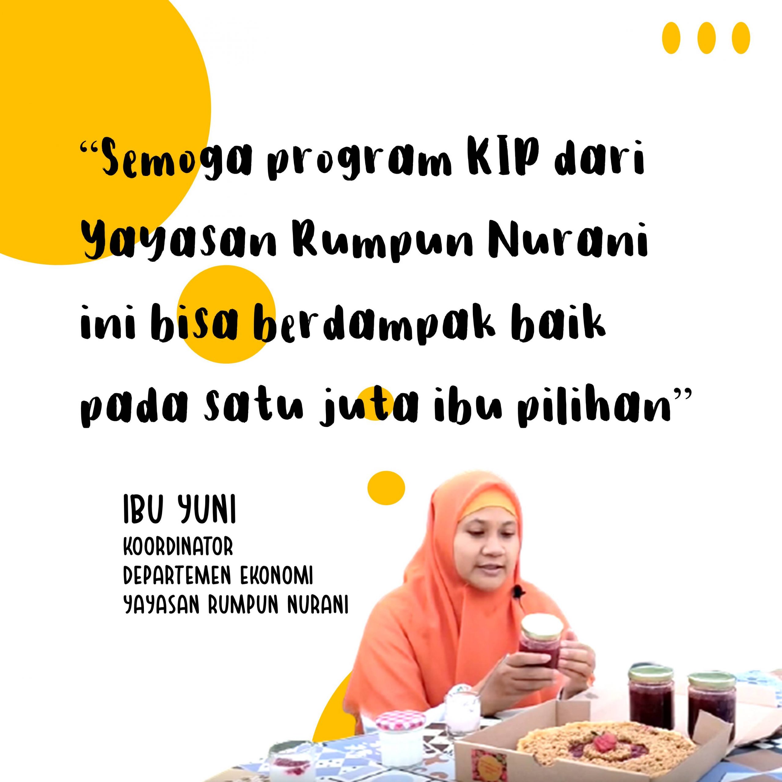 Yuni juga berharap melalui Program KIP ini, dalam jangka panjang dapat mendorong anggotanya untuk dapat berdaya dengan hidup mandiri dan sejahtera. Selain itu Yuni juga berharap Program KIP dapat mendampingi lebih banyak lagi ibu yang menjadi kepala keluarga. “Semoga program KIP dari Yayasan Rumpun Nurani ini bisa berdampak baik pada satu juta ibu pilihan,” tutur Yuni.