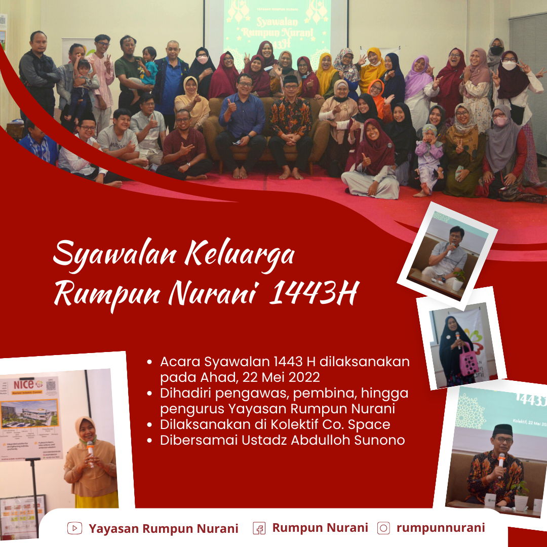 Dalam rangka meningkatkan silaturahim antar anggota keluarga, Yayasan Rumpun Nurani menggelar acara Syawalan 1443 H pada Ahad, 22 Mei 2022 lalu. Seluruh pengawas, pembina, hingga pengurus Yayasan Rumpun Nurani memadati Kolektif Co. Space, mengikuti seluruh rangkaian acara Syawalan tersebut.